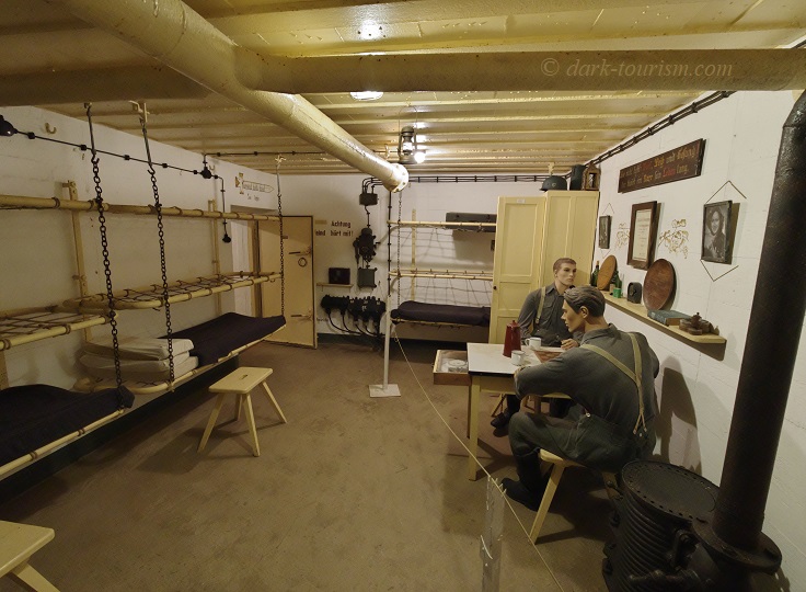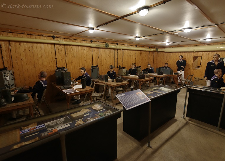 The inside has been “lovingly” restored to look much like it did back when it was in use, complete with lots of communications equipment “manned” by dummy soldiers in German Navy uniforms: