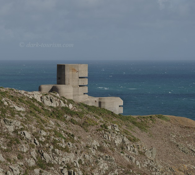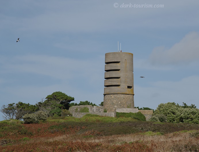 Not far from there you can see what must be the most iconic of all the WWII structures on Guernsey, the MP 4 observation tower/bunker. MP stands for “Marine Peilstände” (‘Navy range-finding stations’) and it was the fourth of five built on the island (out of a planned eight). They supported coastal gun batteries in finding their targets. This one, also referenced as “L’Angle”, you find pictured in many books, brochures, charts and whatnot on Guernsey – and the photo of it below was hence also chosen as the featured one at the top of this post: