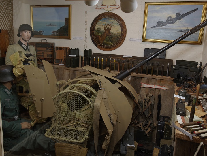 Inside, the museum features the most jumble-room-like collection of militaria I have seen in the Channel Islands. They even trade in militaria: in the museum shop you can buy all manner of more or less rare wartime relics, and some of the clientele I witnessed here were positively enthusiastic about that. Those who get a thrill out of seeing original artefacts from WWII and Nazi memorabilia will love this museum too. I must say, though, that I was less enamoured with it. I found it too crammed full and having seen several other museums with such a focus on militaria I was reaching saturation point. That said, though, there were some remarkable exhibits, and for me those were rather the not-so-military smaller items, such as a collection of Nazi-symbol-bearing crockery or a photo of a Nazi-uniformed man with a Jersey cow that came with the sarcastic caption “A German officer interrogating one of the locals”. Similarly it’s more the little things in this next photo too: look past the life-size Flak installation and spot the circular painting of a stag on the wall – classic German kitsch!