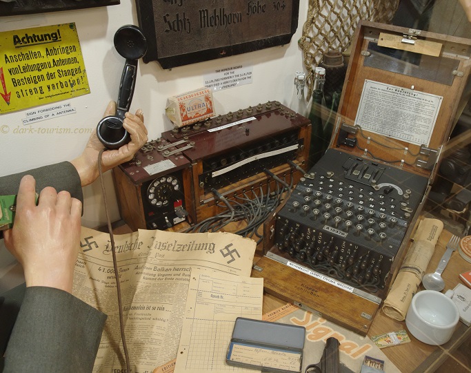 Amongst the heaps of relics and equipment was also an original Enigma machine, as seen in the next photo – note also the copy of a “Deutsche Inselzeitung” (‘German island newspaper’) with the title flanked by two swastikas: