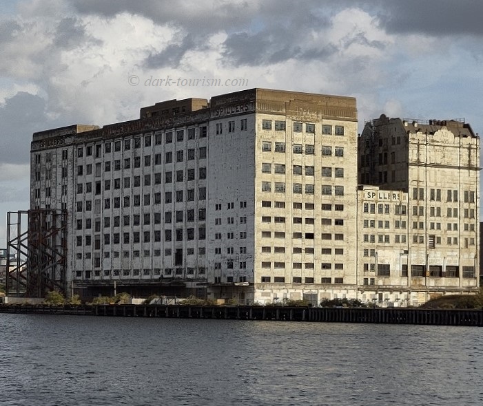 I once had an unsuccessful attempt at getting into this building in the 80s that was thwarted by security. This time I didn’t even bother trying, since I had read that the interior has meanwhile been completely gutted and the whole structure is now also awaiting “redevelopment”. Until a few years ago, though, the Millennium Mills building was a prime destination for urbexers more determined, daring and lucky than me – and they’ve put some fabulous urbex photo series out on the Internet (see e.g. this one – external link, opens in a new tab).