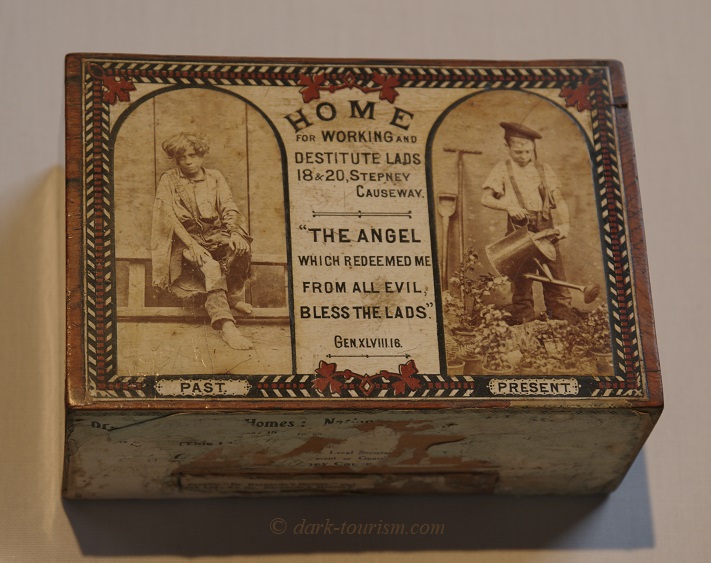 A “Ragged School” was a charity scheme founded by one Dr. Thomas Barnardo from Dublin, who came to London in the second half of the 19th century and was confronted with widespread poverty, disease and destitution amongst the working-class people in the East End of the city. The free “Ragged Schools” were to alleviate the plight of poor children and adolescents and provide them with a basic education and some work. This school in Mile End started operating in 1877 and closed in 1908, at a time when state-funded schools were becoming more common. The purpose of the “Ragged School” is nicely depicted in this exhibit at today’s museum, a sort of before-and-after juxtaposition:
