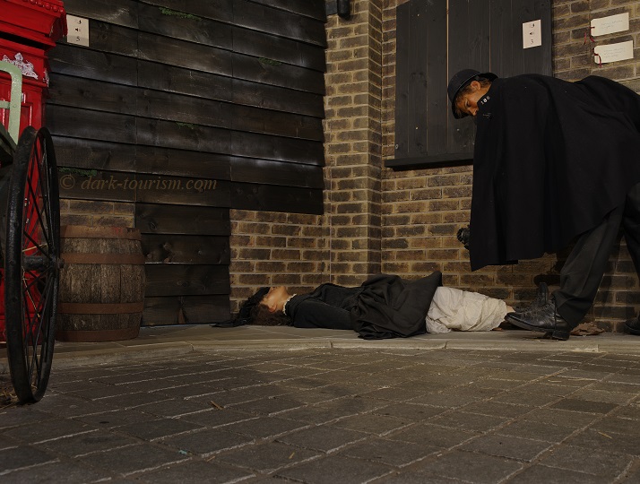 There are many life-size, walk-in “dioramas” or reconstructions in this museum too, including this one depicting the discovery of one of the victims (possibly Elizabeth Stride, as the dummy body is not mutilated):