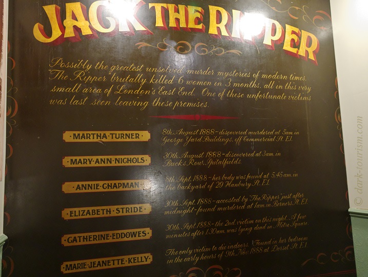 Contrary to the commonly named “Canonical Five”, this sign also includes a sixth name, Martha Turner, one that is not normally associated with the Ripper case. Why it’s included seems to be a bit of a mystery; it may also be a misspelling of Martha Tabram, who was indeed murdered in the area on 7 August 1888, whether by the Ripper or not is contested.