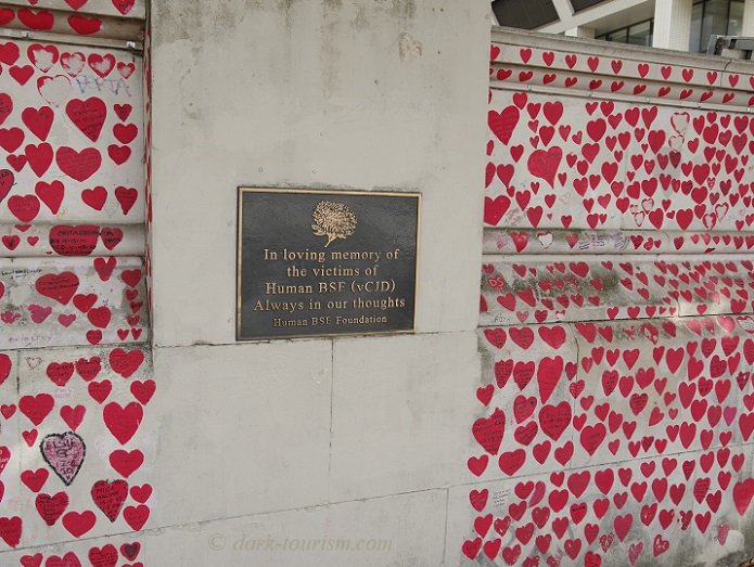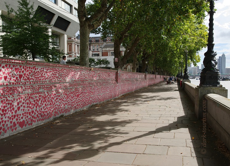It was started in March 2021 as a grass-roots initiative by bereaved relatives of victims of the pandemic. In the meantime it has been officially sanctioned and an association of volunteers called “Friends of the Wall” now look after and maintain the memorial. On the wall are over 240,000 red hearts, mostly with short dedications written on them, and each stands for one of those people in the UK whose death certificate states Covid-19 as the direct cause of death. The wall stretches for ca. 500m along the southern embankment of the River Thames, next to St Thomas’ Hospital.