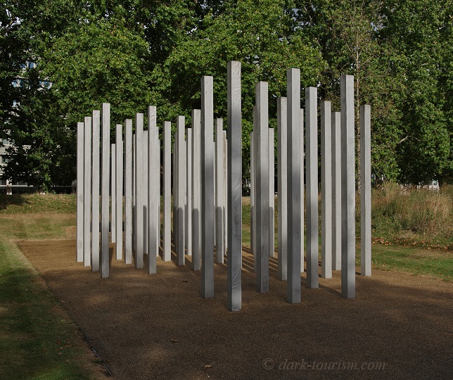 This commemorates the co-ordinated al-Qaeda suicide bombing attacks of 7 July 2005 that took place at four different locations across London, on three trains and one double-decker bus of the London transport system. The 52 steel stelae stand for those victims killed in the attack, grouped together to represent the four locations, the names of which are embossed on the stelae. A separate plaque set into the ground lists the victims’ names.