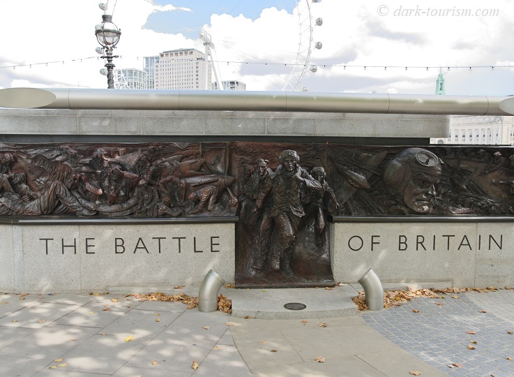 Another monument that I searched out was one I had happened upon by chance when looking for the Battle of Britain Bunker on Google Maps. I found out that since 2005 there has also been a Battle of Britain Monument on Victoria Embankment. It even has its own dedicated website (external link, opens in a new tab) explaining the monument in detail. Here’s a view of the main section with the “scrambling” pilots in the centre: